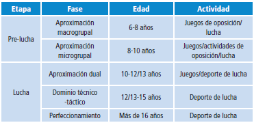 Además, estos hallazgos se asocian con el planteamiento de Ramírez, citado por Annicchiarico-Ramos 33, quien propone unas fases sensibles a las que se deben exponer los niños al iniciar deportes de lucha. De esa manera, a los 13 años el niño debe estar en la fase de lucha con dominio técnico táctico, lo que implica haber apropiado elementos previos de las fases anteriores. De lo contrario, al iniciar la práctica del deporte junto con otros individuos que hayan tenido formación previa en esa etapa, se pueden generar errores en el gesto, en las memorias de movimiento, propiciando la aparición de lesiones. Las fases mencionadas se muestran en la Tabla 7.
