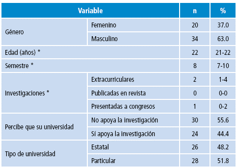 De los 54 encuestados, 20 (37.0%) fueron del género femenino, 40 (74.1%) no habían realizado una publicación científica y la mediana de edad fue de 22 años (rango intercuartílico: 21-22 años) (Tabla 1 y Figura 1).