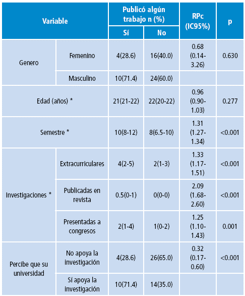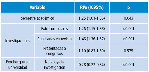 Results: When performing multivariate analysis, it was associated with increased participation in scientific research the fact of being in a superior academic semester (RPA: 1.25; 95% CI: 1.01-1.56; p value: 0.043), more of extracurricular investigations (RPA: 1.26; 95% CI: 1.15-1.38; p value <0.001). Likewise, the lower frequency of publications associated with the perception of poor support from the university (RPA: 0.28; 95% CI: 0.22-0.34; p value <0.001), adjusted to the number of papers presented in congresses and the university of origin.