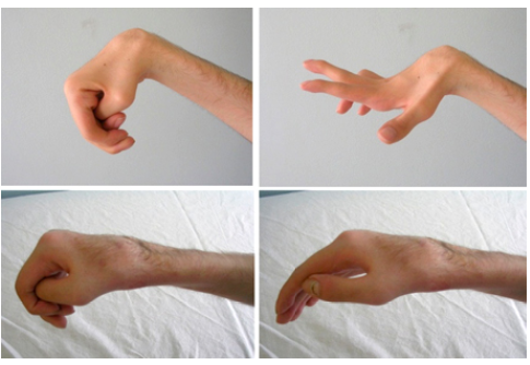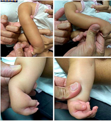 Entre las características clínicas típicas de la AMC se observa piel delgada, atrofia muscular, micrognatia, trismus, entre otras 1. En las extremidades superiores se tienen como hallazgos comunes la disminución o ausencia de pliegues en zonas de flexión, la rotación interna del hombro y la ausencia o limitación marcada de flexión de codo, mientras que en la muñeca se encuentra flexión extrema y desviación cubital 6-10. A su vez, los dedos adoptan diferentes tipos de deformidades entre las que se encuentran la camptodactilia y aducción del pulgar 3,8.