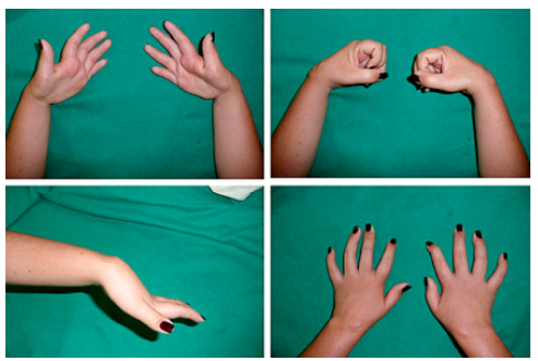 Conclusion: A decrease or absence of folds in flexion areas, as well as internal shoulder rotation, marked limitation of elbow flexion, wrist flexion and ulnar deviation were observed in the upper limbs. Camptodactyly and thumb adduction were found on the fingers. Surgeries improved daily activities function. The treatment is individualized and takes into consideration the degree of affectation.