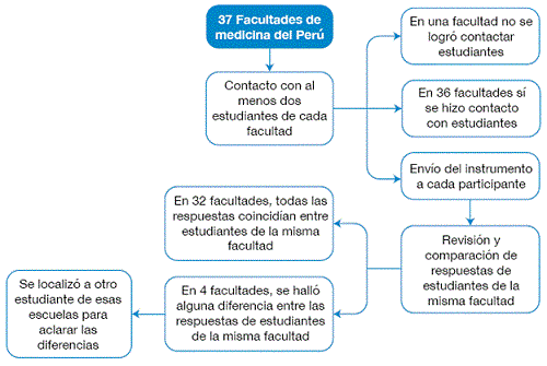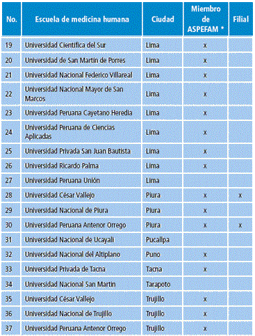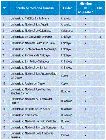 Se elaboró un listado de las escuelas de medicina humana de Perú, para lo cual se utilizó la lista de las escuelas miembros de la Asociación Peruana de Facultades de Medicina (ASPEFAM), obtenida durante julio del 2015. Esta lista no incluyó a las escuelas de medicina humana creadas recientemente, por lo cual además se realizaron búsquedas por internet y se solicitó apoyo a la Sociedad Científica Médico-Estudiantil Peruana (SOCIMEP), que cuenta con sociedades en varias escuelas peruanas. De esta manera, se logró listar 37 escuelas (Tabla 1).