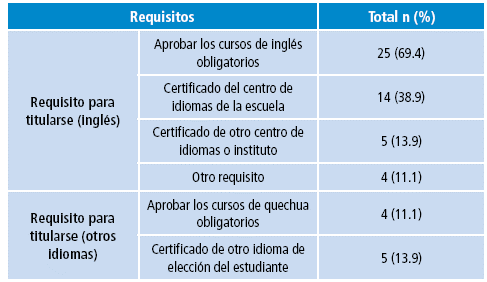 Respecto a los requisitos para la titulación relacionados con los cursos de idiomas, 36 (100%) facultades tuvieron algún requisito relacionado con el inglés para titularse y 9 para hacerlo en otra lengua (Tabla 2).