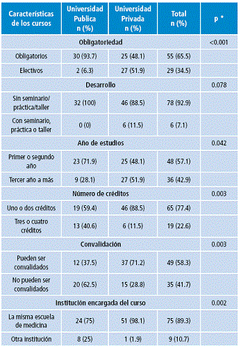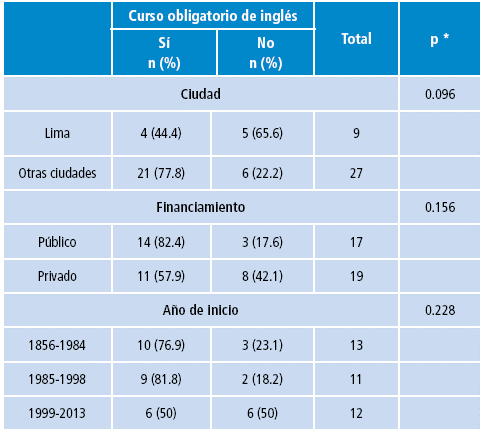 Al evaluar las características asociadas con tener al menos un curso obligatorio de inglés, se halló que 4 (44.4%) de las 9 escuelas ubicadas en Lima tuvieron un curso obligatorio de este idioma, a diferencia de 21 (77.8%) de las 27 ubicadas en otras ciudades. Asimismo, 14 (82.4%) de las 17 escuelas públicas y 11 (57.9%) de las 19 privadas ofrecían por lo menos un curso obligatorio de inglés. Además, 19 (79.2%) de las 24 escuelas fundadas antes de 1999 y 6 (50%) de las 12 fundadas a partir de esta fecha ofrecían por lo menos un curso obligatorio de inglés. Sin embargo, estos factores obtuvieron un p>0.05 con la prueba exacta de Fisher (Tabla 3).