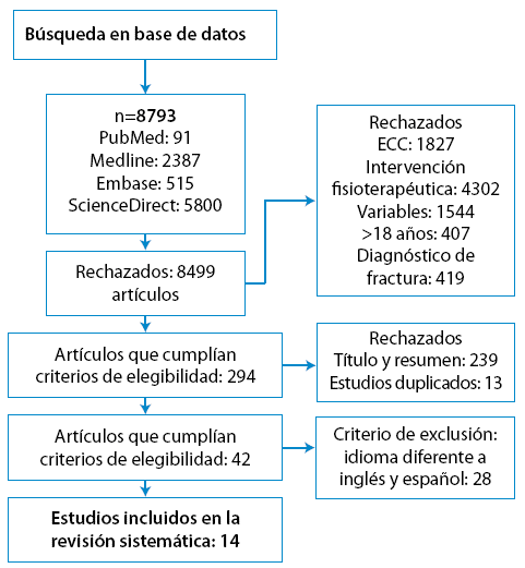 La búsqueda de artículos científicos se realizó entre julio y septiembre de 2015 en las bases de datos ScienceDirect, PubMed, Medline y Embase; esta búsqueda estuvo orientada a identificar ensayos clínicos que evaluaran el efecto de las intervenciones fisioterapéuticas en FDR. Las palabras clave utilizadas fueron los términos DeCS "Colle's fracture", "radius fractures", "rehabilitation", "physical therapy" y los términos MeSH "Radius Fractures", "Colles Fracture", "Physical Therapy Modalities".
