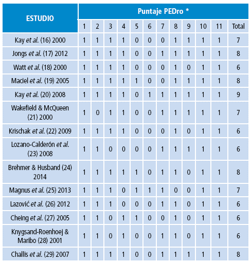 Cada estudio fue revisado y evaluado por dos fisioterapeutas en formación de décimo semestre de la Universidad del Rosario, quienes fueron entrenadas en la aplicación de la escala. Los estudios con una puntuación de 9 y 10 se consideraron de calidad "excelente"; con puntuaciones entre 6 y 8, de "buena" calidad; con puntuaciones de 4 a 5, de calidad "regular", y con puntuaciones por debajo de 4, de "mala" calidad 15. En esta revisión sistemática solo se incluyeron los estudios que tenían una puntuación excelente y buena como se muestra en la Tabla 1.