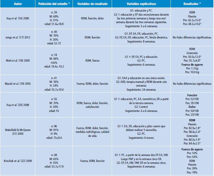 Kay et al.20 aplicaron un programa fisioterapéutico versus ninguna intervención; al grupo experimental se le proporcionó educación, control de edema, ejercicio activo, ejercicios isométricos de muñeca y fortalecimiento luego de la tercera semana. La intervención mostró beneficios significativos en el dolor y en la funcionalidad.