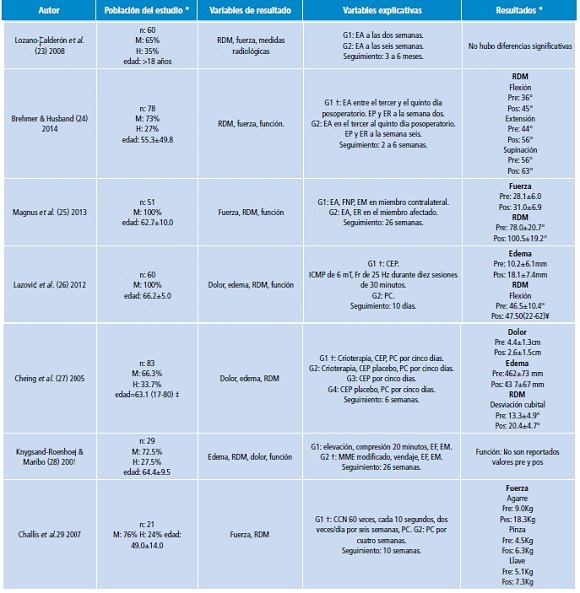 Las intervenciones reportadas en los estudios revisados incluyeron modalidades del ejercicio terapéutico como ejercicio pasivo 16-19, ejercicio activo-asistido 20, ejercicio activo 21-24, ejercicio activo-resistido 25,26 y modalidades físicas-térmicas 27, mecánicas 28 y electromagnéticas 27,29.