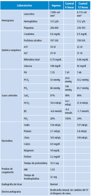 Respecto a las ayudas de laboratorio, se han informado elevaciones leves y transitorias de las transaminasas y la fosfatasa alcalina hepáticas, cuyos valores regresan a la normalidad antes de 72 horas 26,28,33-35. Los valores de creatinina, nitrógeno ureico sérico, sodio y potasio suelen permanecer inalterados. Del mismo modo, se ha reportado la presencia de alteraciones del equilibrio ácido-base, como son acidosis o alcalosis respiratoria y acidosis metabólica 9,36. En el caso de la paciente del presente caso no se evidenció alteración de la química sanguínea, a excepción de hipopotasemia leve.