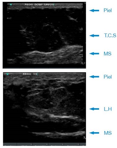 La ecografía de pared abdominal confirmó la presencia de cambios compatibles con LH e infiltración grasa de la pared muscular. La Figura 1 muestra un ejemplo de los cambios específicos evidenciados por ultrasonido e identificados como signos radiológicos para esta entidad 7.