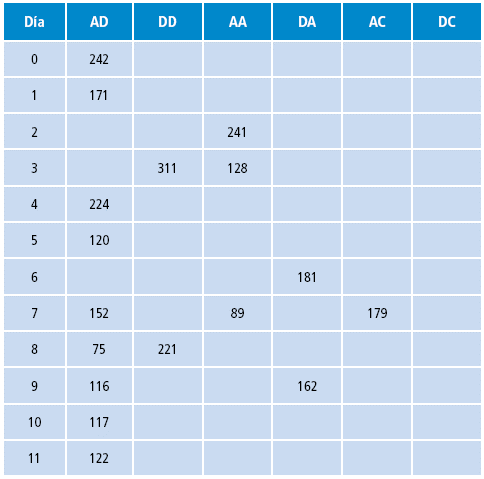 En el examen físico se evidenció panículo adiposo prominente infraumbilical con induración indolora bilateral del tejido subcutáneo por palpación en los SI repetidos para aplicar insulina; además, la última glucemia basal era de 299 mg/dL y la A1c de 11%, por lo que se dieron instrucciones a la paciente para descansar estos sitios con LH infraumbilical e iniciar la rotación diaria para la aplicación de insulina con técnica adecuada y cambio de jeringa a esfero de insulina con agujas de 4mm, sin cambiar el tipo ni la dosis. Del mismo modo, se indicó continuar metformina igual y automonitoreo de glucometrías del día 0 al 11 (Tabla 1); la paciente logró control de glucometría, mejoría de los sitios de LH al dejar de aplicar insulina en estas zonas durante unas semanas y mejoría de A1c en 9.2% a los 4 meses y de 8.7% a los 11 meses. Es importante comentar que los sentimientos de ansiedad y depresión de la paciente mejoraron, llevándola a fijarse nuevas metas de formación y a optimizar el ambiente en su entorno familiar y su calidad de vida.