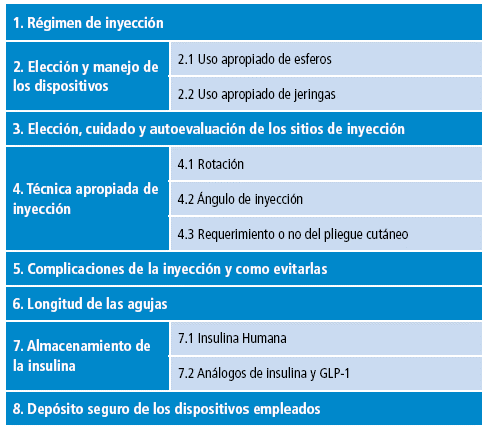 Hasta el momento, es difícil determinar cuál de los componentes empleados para mejorar la técnica de aplicación tiene mayor impacto en el control de la glucemia (evitar el reúso de agujas, la longitud de la aguja, la rotación del SI) y en la formación profesional en educación diabetológica; por tanto, las intervenciones del equipo de salud (médicos generales y especialistas, enfermeros, educadores, entre otros) deben incluir búsqueda activa de zonas de LH con interrogatorio, inspección y palpación 17. Así mismo, se debe indicar la necesidad de evitar el reúso de agujas y de prescribir agujas de 4-6mm de longitud para los esferos de insulina 18; en este sentido, debe fortalecerse la formación de médicos y enfermeros, tanto en pregrado como posgrado, sobre educación acerca de la técnica de aplicación de insulina. En lo posible, se debe destinar un espacio complementario distinto a la consulta, organizar talleres de pacientes y su familia y dar espacio para evaluar la técnica empleada por cada paciente; por esto, es crucial contar con un equipo de trabajo interdisciplinario. La Tabla 2 muestra los tópicos incluidos en las guías y recomendaciones para una adecuada técnica de aplicación de insulina en adultos 15.