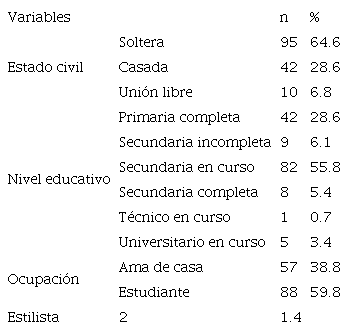 Se identificaron 154 historias clínicas de gestantes adolescentes en el periodo de estudio. De estas, 7 tuvieron atención de parto en otras instituciones, por lo que finalmente se analizaron los registros de 147 adolescentes. El promedio de edad fue de 17±1.5 años, el 38.8% se ocupaban en las actividades del hogar y el 59.8% eran estudiantes (Tabla 1).