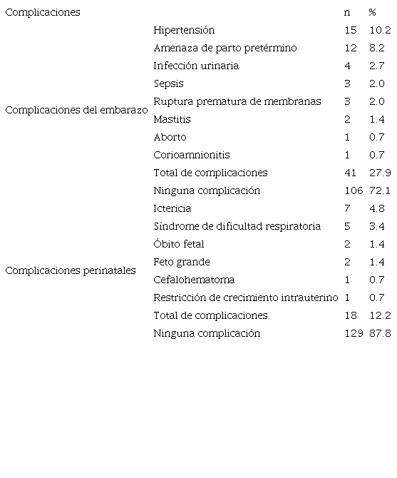 Resultados: El promedio de edad fue 17±1.5 años; 59.8% eran estudiantes (secundaria y educación superior) y 64.6%, solteras. En cuanto a los controles prenatales, 127 (86.4%) los iniciaron tardíamente y 108 (73.5%) tuvieron menos de 4. La frecuencia general de complicaciones obstétricas fue 27.9%, entre las que se destacan los trastornos hipertensivos del embarazo (10.2%) y la amenaza de parto pretérmino (8.2%); no se presentaron muertes maternas. Por su parte, las patologías neonatales más comunes fueron ictericia neonatal (4.8%) y síndrome de dificultad respiratoria (3.4%).