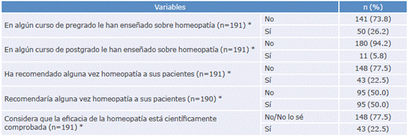 Otras preguntas que se realizaron sobre homeopatía fueron: "¿En algún curso de pregrado le han enseñado sobre homeopatía?", "¿En algún curso de posgrado le han enseñado sobre homeopatía?", "¿Ha recomendado alguna vez homeopatía a alguno de sus pacientes?" y "¿Recomendaría alguna vez homeopatía a alguno de sus pacientes?", todas con dos alternativas de respuesta (Sí o No).