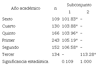 Los resultados del ANOVA fueron significativos (p=0.001) para año académico y género, pero no para la interacción entre ambos (p=0.502). Además, los valores de eta cuadrado y la potencia para año académico, género y su interacción entre sí fueron 0.04, 0.019 y 0.005 y 1.0, 0.988 y 0.312, respectivamente. A partir de estos resultados, se infirió que el tamaño del efecto de las diferencias estadísticas encontradas no era alto y no era necesario aumentar el tamaño de la muestra para alcanzar el valor de la potencia aceptada (0.80).