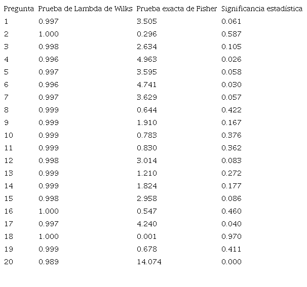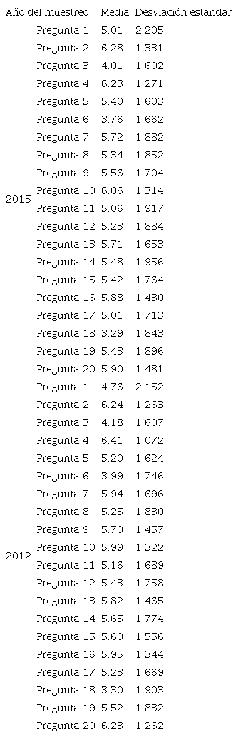 La Tabla 3 presenta la medias y las desviaciones estándar para cada una de las 20 preguntas del cuestionario respondidas por los estudiantes de ambos grupos (2015 y 2012). Por su parte, la Tabla 4 describe los resultados de la comparación entre las medias por pregunta entre ambos grupos, donde para la prueba λ se observan diferencias estadísticamente significativas (p<0.05, p<0.001) en las preguntas 4,6,17 y 20, así como para la prueba M de Box (p<0.005).