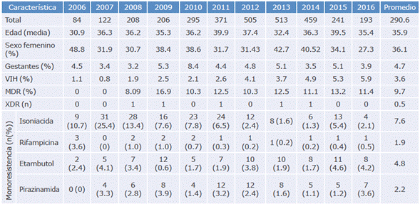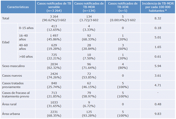 De los 3 602 pacientes estudiados, 3 264 (90.61%) presentaron TB sensible y 134 (3.72%),TB-MDR; el rango de edad más afectado fue el de 16 a 40 años, y el sexo masculino fue el más predominante en contraer TB. La incidencia de TB-MDR fue mayor en pacientes que habían recibido tratamiento previo (4.71 porcada 100 000 habitantes) que en quienes lo recibían por primera vez (3.61 porcada 100 000 habitantes). El tratamiento fracasó en el 100% de los pacientes con TB-XDR y en el 58.97% de quienes presentaron TB-MDR. El área urbana presentó mayor incidencia de TB-MDR en comparación con la zona rural: 9.83 y 0.48, respectivamente (Tabla 1). En la Tabla 2 se presentan las principales características de los casos de TB registrados según el año.