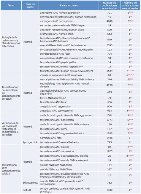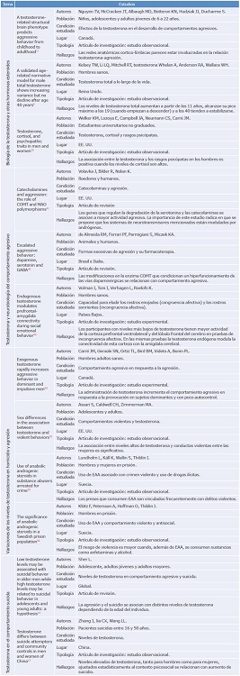 Resultados: De los 66 estudios incluidos en la revisión, más del 50% asociaron el comportamiento agresivo u homicida con niveles elevados de testosterona, hormona que podría modular la actividad de las vías cerebrales serotoninérgicas y dopaminérgicas involucradas en el comportamiento agresivo por medio de receptores androgénicos y estrogénicos. Se encontraron relaciones entre uso de esteroides anabólicos y homicidio, y entre testosterona circulante en mujeres y rasgos de personalidad antisocial. Asimismo, se observaron cambios de concentraciones séricas de testosterona en sujetos con tendencias suicidas.