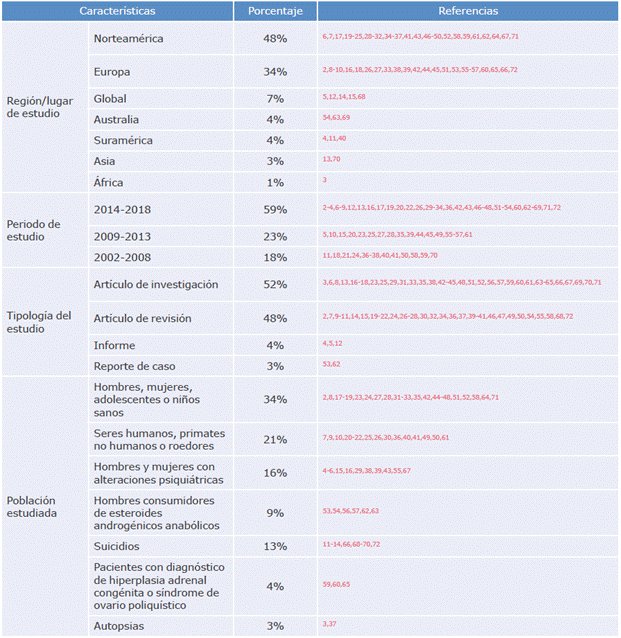 Se incluyeron 66 estudios, de los cuales el 95.8% estaban escritos en inglés, el 59% se habían publicado entre 2014 y 2018 y el 79% correspondían a investigaciones realizadas en humanos (Tabla 2). Más del 50% de las referencias incluidas asociaron el comportamiento agresivo u homicida con niveles elevados de testosterona y 82% fueron publicadas en Norteamérica y Europa. En la Tabla 3 se incluyen los estudios más relevantes para el objetivo del estudio.