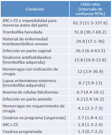 Introducción: En mujeres, el riesgo de desarrollar enfermedad tromboembólica venosa (ETV) es 5 a 6 veces mayor durante el embarazo, riesgo que puede aumentar considerablemente si existen antecedentes personales o familiares de otros estados protrombóticos. La ETV es una de las principales causas de morbimortalidad en esta población, por lo que para evaluar la pertinencia de usar tromboprofilaxis, ya sea farmacológica o no farmacológica, es necesario reconocer oportunamente los factores de riesgo clínico asociados a esta condición.