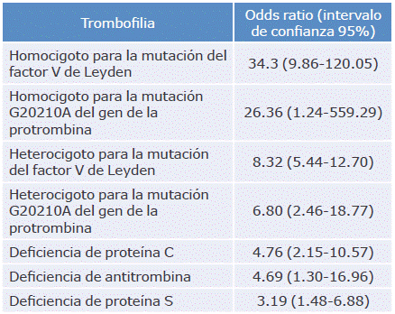 Existen algunas condiciones que contribuyen al desarrollo de estados protrombóticos (Tabla 2) y que, según Robertson et al.,3 pueden clasificarse de acuerdo a su odds ratio.