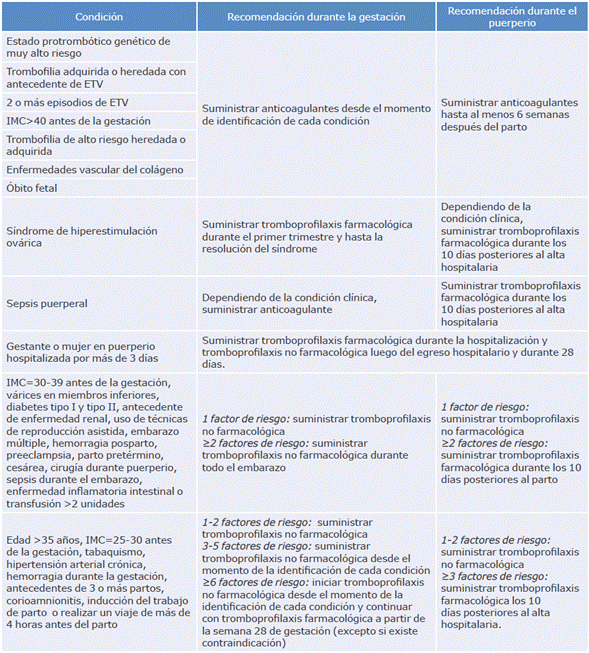 Se recomienda realizar pruebas de tamizaje de estados protrombóticos durante la gestación, el parto y el puerperio, ya que la identificación oportuna de la ETV permitirá disminuir las tasas de morbimortalidad en esta población mediante la implementación de medidas tromboprofilácticas tanto farmacológicas como no farmacológicas. En relación a la tromboprofilaxis, se recomienda su uso en condiciones clínicas tales como estado protrombóticos heredado, ETV recurrentes, obesidad mórbida y enfermedad vascular del colágeno.