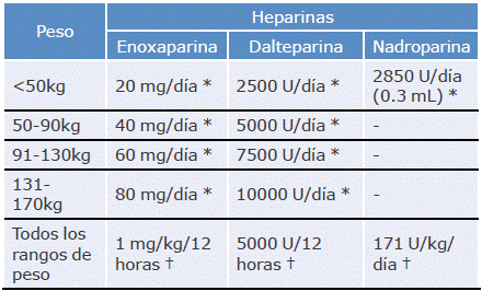 Una vez se dé la indicación de iniciar tromboprofilaxis, es pertinente elegir la opción farmacológica más adecuada. Las heparinas, al no atravesar la barrera hematoplacentaria y no representar riesgos fetales, son los agentes de primera línea de manejo profiláctico; dentros de estas se recomiendan las de bajo peso molecular (HBPM) sobre las no fraccionadas (HNF), dado que las primeras son de fácil administración, tienen una eficacia anticoagulante más predecible y no requieren seguimiento o control por parte del laboratorio.36,37 La indicación de las HBPM se debe hacer de acuerdo al peso y función renal de cada paciente (Tabla 5).