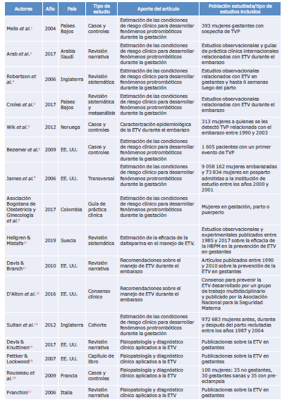 En total, se incluyeron 52 documentos que correspondieron a revisiones narrativas (n=15), revisiones sistemáticas (n=8), guías de práctica clínica (n=6) -de las cuales 1 es colombiana-, boletines y consensos clínicos (n=5), reportes de caso (n=1), capítulos de libro (n=3) y estudios transversales (n=4), de casos y controles (n=4), de cohorte (n=4) y experimentales (n=2). Solo 1 publicación fue de origen colombiano, las demás fueron inglesas, norteamericanasy asiáticas. Los documentos abarcaban desde recopilación teórica etiológica de la ETV, hasta recomendaciones de manejo terapéutico y profiláctico, aspectos que se exhiben en detalle en la Tabla 1.