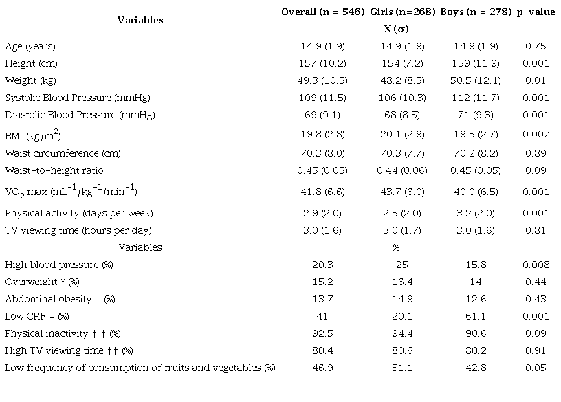 Materials and methods: Cross-sectional study conducted in a sample of 546 adolescents aged between 11 and 18 years from 14 randomly selected schools in Montería. Blood pressure, anthropometric, and fitness measures were evaluated by trained personnel using standardized protocols and instrumentation. The association of HBP with fitness and fatness was analyzed using logistic regression models.