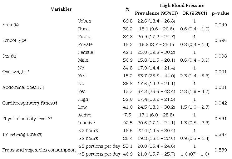 Table 2 shows the prevalence of HBP according to some specific characteristics and its bivariate associations. Boys (OR: 0.6; 95%CI: 0.4-0.9) and adolescents who live in rural areas (OR: 0.6; 95%CI: 0.4-1.0) were less likely to have HBP. Adolescents with OW (OR: 2.3; 95%CI: 1.4-3.9), AO (OR: 2.8; 95%CI: 1.6-4.7), and low CRF (OR: 1.5; 95%CI: 1.0-2.3) were significantly more likely to have HBP. There were no significant bivariate associations between HBP and school type, physical inactivity, TV viewing time, and fruits and vegetables consumption.
