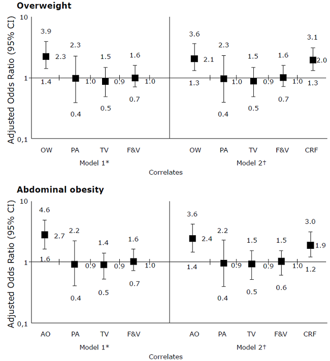 The logistic regression analysis results of the association between HBP and OW and AO, as well as other potential correlates, are depicted in Figure 1. Results show that HBP was associated with OW (adjusted odds ratio (AOR): 2.3;95%CI: 1.4-3.9) (Model 1). Model 2 shows that HBP was associated with OW (aOR: 2.1; 95% CI: 1.3-3.6) and lowCRF(AOR: 2.0; 95%CI: 1.3-3.1). Also, HBP was associated with AO in Model 1 (aOR: 2.7; 95%CI: 1.6-4.6) and in Model 2 (aOR: 2.4; 95%CI: 1.4-4.1). The inclusion of CRF in Model 2 did not attenuate the association of HBP with OW and AO.