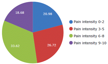 On a scale from 0 to 10, the scores of the 349 patients whose pain intensity was measured by doctors on admission were as follows: 73 (20.9%) reported a 0-2 score; 94 (26.9%), a 3-5 score; and 182, (52.15%) reported severe to unbearable pain (≥6) (Figure 1).