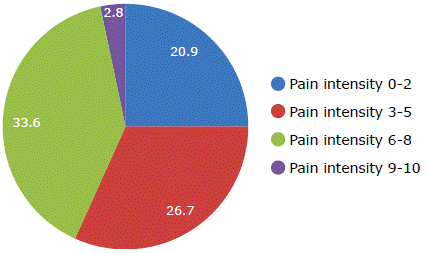 On the other hand, the following scores were found for the 275 patients whose pain intensity measurement on admission was performed by nurses: 120 (43.6%) reported a score 0-2; 84, (30.5%) said their pain was 3-5; and 71 (25.7%) reported they were experiencing severe to unbearable pain (≥6) (Figure 2).