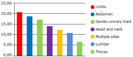 According to the medical records, pain was classified based on the duration of the symptoms as acute (n=578), chronic (n=35), cancer pain (n=17), and undefined (n=4). Limbs were the body part in which pain was most frequently located (Figure 3).