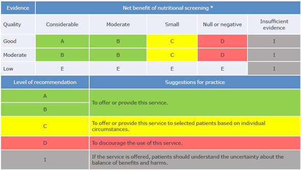 Finally, the quality of evidence was assessed following the recommendations of the U.S Preventive Services Task Force, a tool developed by the Canadian Task Force on the Periodic Health Examination to evaluate preventive measures and to help researchers extract information from clinical studies in the form of evidence-based medicine recommendations.24,25 To achieve this, the design of the studies analyzed was considered first in order to establish the level of certainty of each study; then, the nutritional screening tools with the same level of certainty were grouped and the degrees of the recommendations were established according to the level of certainty assigned and the net benefit (greater number of benefits over the number of harms) of their use (Table 1).