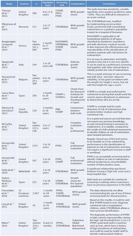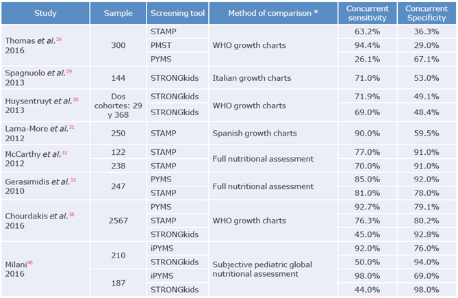 Results: Fifteen studies were included in the review as they met the inclusion criteria. In addition, 7 nutrition screening tools were identified (PYMS, iPYMS, PeDiSMART, PNR, STAMP, PMST and STRONGkids). According to guidelines of the European Society for Clinical Nutrition and Metabolism, the PYMS, iPYMS and STRONGkids tools simultaneously assess prognostic variables such as current nutritional status, stability, expected improvement or worsening of the condition, and the influence of the disease process in nutritional deterioration. Regarding concurrent validity, data analysis shows that PYMS, iPYMS and PMST have sensitivities >85%, and that PYMS has a specificity >85%. In terms of reproducibility, PEDISMART, STRONGkids, STAMP and PYMS have an acceptable interobserver agreement (k>0.41).