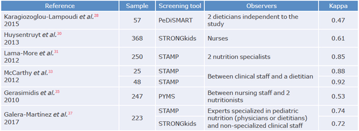 Table 4 presents the included studies that evaluate the concurrent validity of 5 pediatric nutritional screening tools (STAMP, PMST, PYMS, iPYMS and STRONGkids). In turn, Table 5 depicts the studies that included results on concordance among observers where it was considered sufficient for Kappa values >0.41.41