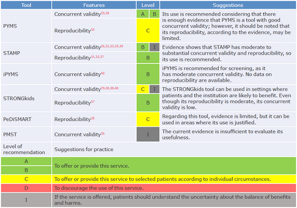 Table 6 presents recommendations for the use of the PYMS, STAMP, iPYMS, STRONGkids, PeDiSMART and PMST tools according to desirable characteristics such as concurrent validity and reproducibility. Nevertheless, it should be remembered that these are not the only characteristics to consider; ease of use, the time required, and predictive validity should also be considered, 23 although that was not the case of this paper due to the limited information available. Even so, it is expected that the results reported here will help health staff choose the best option for nutritional screening in pediatrics from the tools available for implementation in institutional protocols.