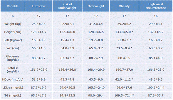 After analyzing anthropometric variables and the lipid profile, a significant difference was found between children in the overweight, obesity and adequate weight groups with high WC compared to children in the eutrophic and at risk of underweight groups (p<0.05).