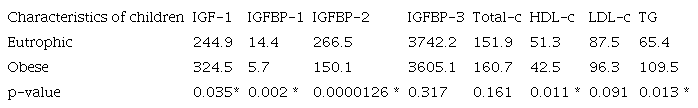 The relationships between IGFBP-1 and IGFBP-2 levels and the lipid profile variables (Table 2) were evaluated, finding that both proteins are inversely correlated with TG concentrations and directly correlated with HDL-c values. Some variables were also compared between eutrophic and obese children (Table 3).