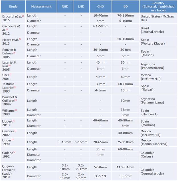 No studies on the length and diameters of the bile ducts are reported in Colombia, but similar averages are reported worldwide and are consistent with the bile duct paths of most of the data recorded in anatomy and surgical texts. However, some books do not measure or describe the dimensions of all ducts 23-34 (Table 4).