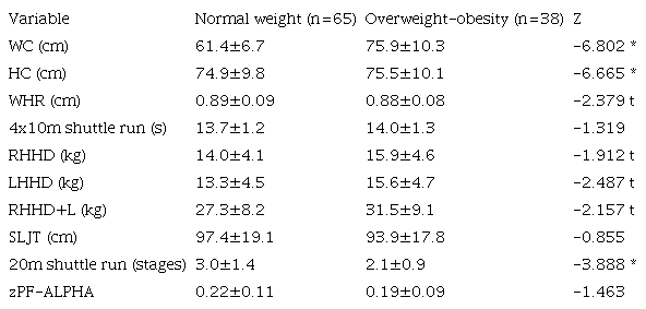 Schoolchildren with normal weight had lower WC, HC (p<0.01) and WHR (p<0.05) values, as well as better physical performance in the 20m shuttle run (p<0.001). Overweight-obese children had higher values in the right hand-held dynamometry (RHHD), left hand-held dynamometry (LHHD) and right + left hand-held dynamometry (RHHD+L) tests (p<0.05) (Table 2). Physically active schoolchildren had lower BMI, WC and HC (p<0.05) and better performance in the 20m shuttle run test (p<0.01) (Table 3).