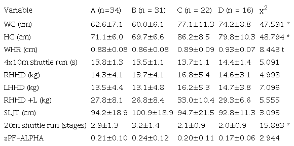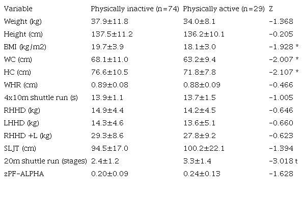 Physically active students with normal weight had higher zPF-ALPHA values. These differences were only significant in the 20m shuttle run test (p<0.001), in which lower WC, HC, (p<0.01) and WHR (p<0.05) values were also obtained (Table 4).