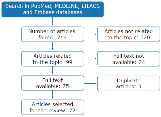 The search yielded 719 results; two co-authors simultaneously and independently reviewed abstracts and titles to determine if they met the inclusion criteria (studies on oral tolerance and human transplantation). In case of disagreement, a third author resolved the discrepancy. After this review, it was determined that 99 articles met the inclusion criteria; 24 of them were excluded because the full text was not available and 3 because they were duplicated. In total, 72 relevant articles were selected for this review (Figure 1).