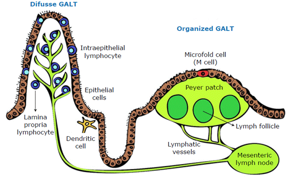 Another important part of GALT is intraepithelial lymphocytes, which regulate intestinal homeostasis, maintain barrier function, respond to infection, and modify the adaptive and innate immune response. The most important intraepithelial lymphocytes are CD8+T cells. 3
