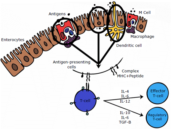 The induction of the immune response occurs after processing the antigen captured in the intestinal lumen. To this end, APCs express the antigen through molecules of the major histocompatibility complex, allowing T lymphocytes to recognize it. In addition, depending on the microenvironment, T-lymphocytes can be classified as regulators or effectors; the former are responsible for oral tolerance, while the latter are involved in cytolytic activity32 (Figure 3).