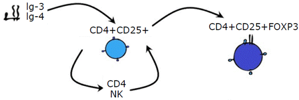 Type 3 and 4 immunoglobulin transcriptase enzymes favor the induction of co-stimulatory molecules in CD4+ CD25+ Treg cells. This makes the latter tolerant to donor antigens by stimulating CD4+ T cells and natural killer cells, which produce positive feedback on CD4+ CD25+ Treg cells to express the FOXP3 protein. As a result of this expression, an antigenic microchimerism is formed, and it allows immune tolerance and prevents rejection of the transplanted organ (Figure 4).51