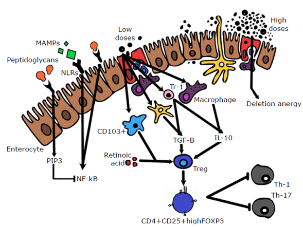 One of the best ways to understand oral tolerance is the identification of the role of dendritic cells, retinoic acid and CD103+ lymphocyte differentiation cluster in their induction. 3 The expansion of dendritic cells in vivo improves oral tolerance, since they induce the expression of Treg FOXP3+ cells when found in the mucosa by means of TGF-β and retinoic acid signaling pathways.3 Dendritic cells in the mucosa can be divided into two types: CD103+ (tolerogenic) and CD103- (non-tolerogenic). Tolerogenic cells produce retinoic acid and induce FOXP3+ Treg cells if given TGF-β. 12,46