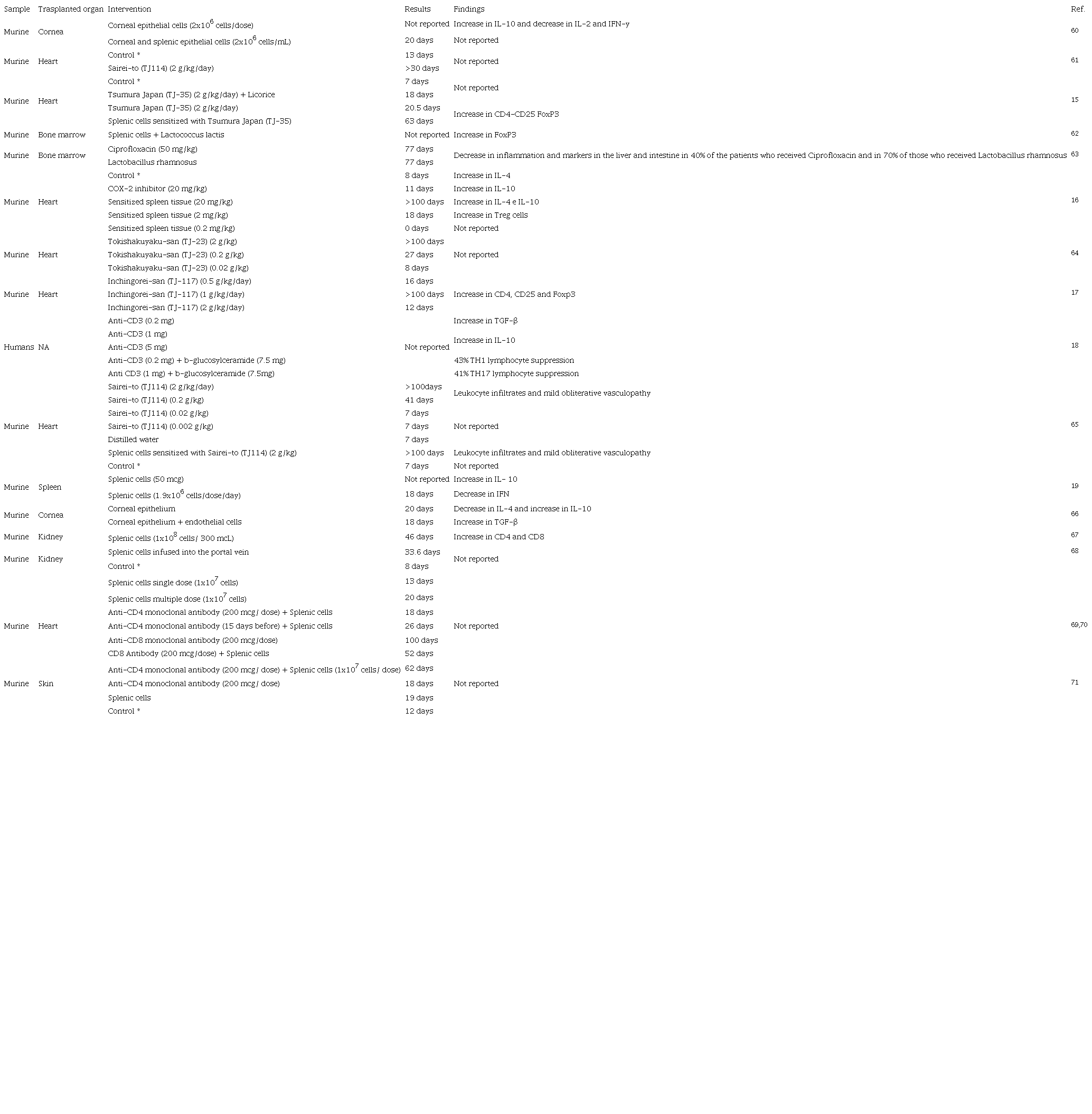 Most of the evidence found comes from murine models with heart, kidney, cornea, and bone marrow transplants, as shown in Table 2.